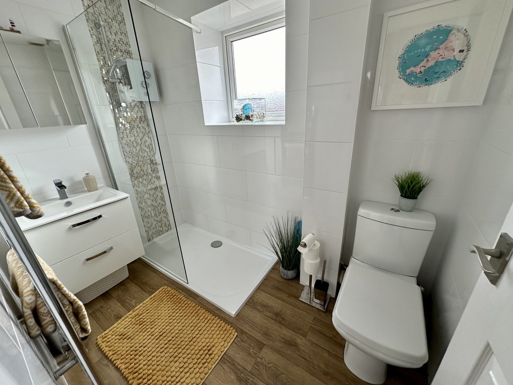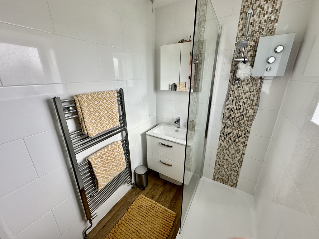 SHOWER ROOM 8' 1" x 4' 9" (2.47m x 1.47m) Immaculately presented shower room with a low flush WC, wash hand basin within a floating vanity unit, mirrored wall mounted cabinet, walk in shower area with glass divide, electric shower unit above, tiled walls, extractor fan, spotlights, heated towel radiator and front facing double glazed frosted window.