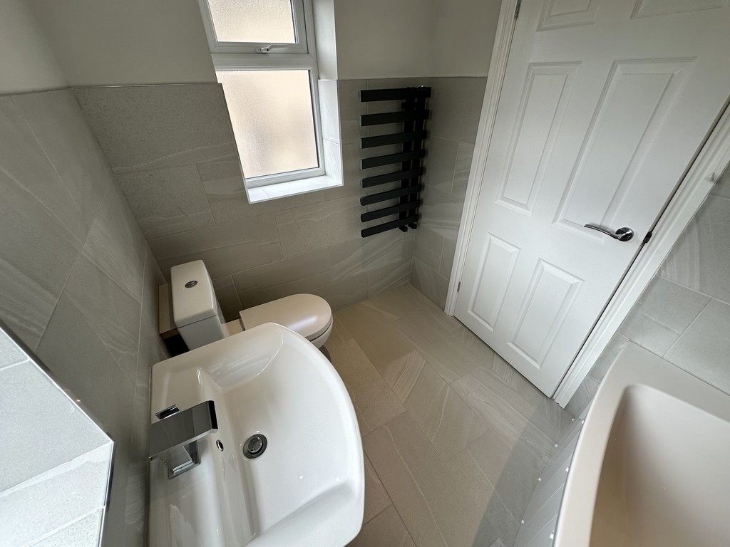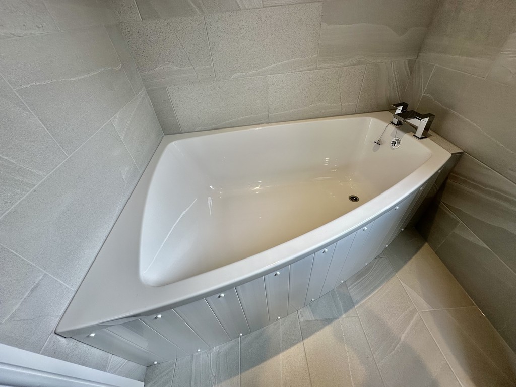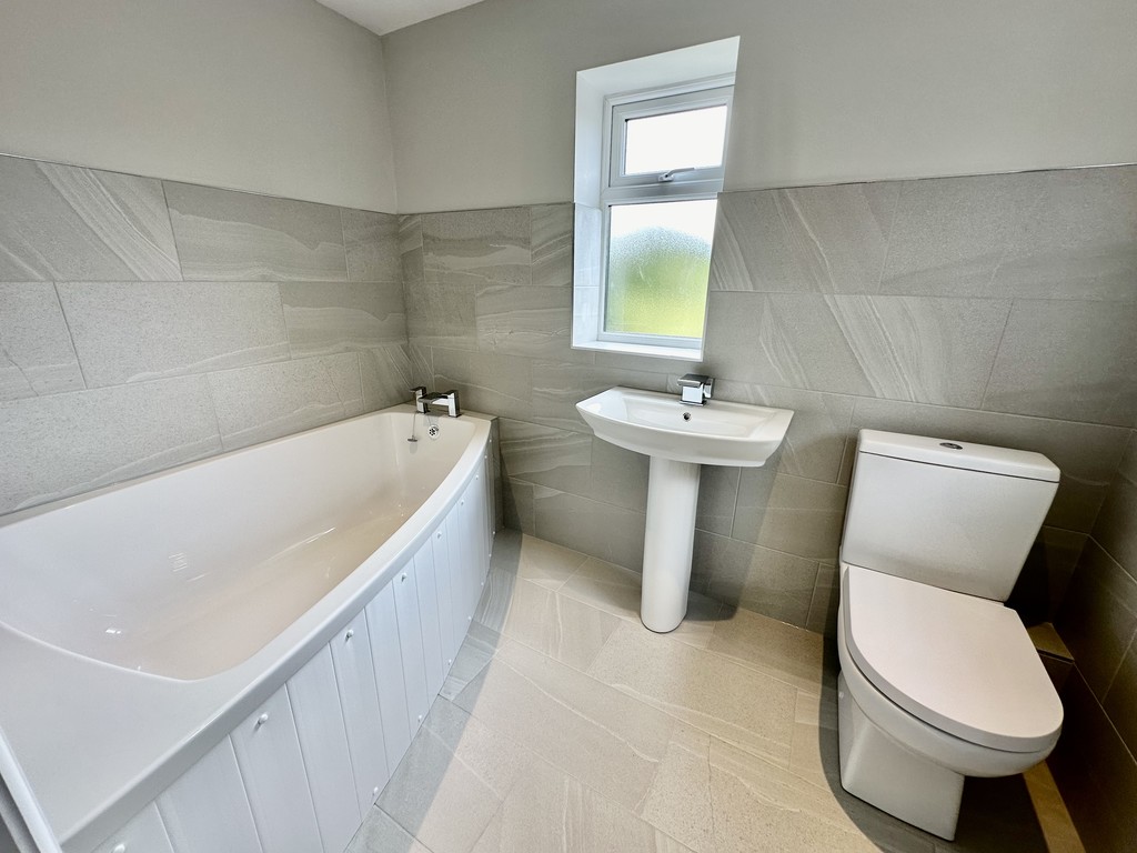 BATHROOM 8' 4" x 5' 3" (2.56m x 1.62m) Beautifully finished bathroom with corner bath, low flush WC, wash hand basin, heated towel radiator, tiled flooring, partially tiled walls, spotlights, extractor fan and two rear/side facing double glazed frosted windows.