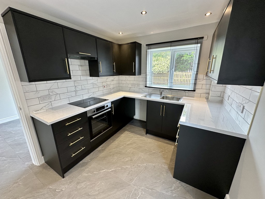 KITCHEN 8' 4" x 10' 4" (2.55m x 3.16m) Immaculately presented kitchen with a stylish finish, including kitchen cabinetry at both eye and base level, beautiful work surfaces incorporating a single bowl sink, four ring electric hob with extractor fan above, single electric oven, space for a fridge/freezer, space for a washing machine, partially tiled splash backs, spotlights, tiled flooring, storage cupboard beneath the stairs, control for the electric garage door, side facing frosted double glazed door to the driveway and a rear facing double glazed window overlooking the garden.