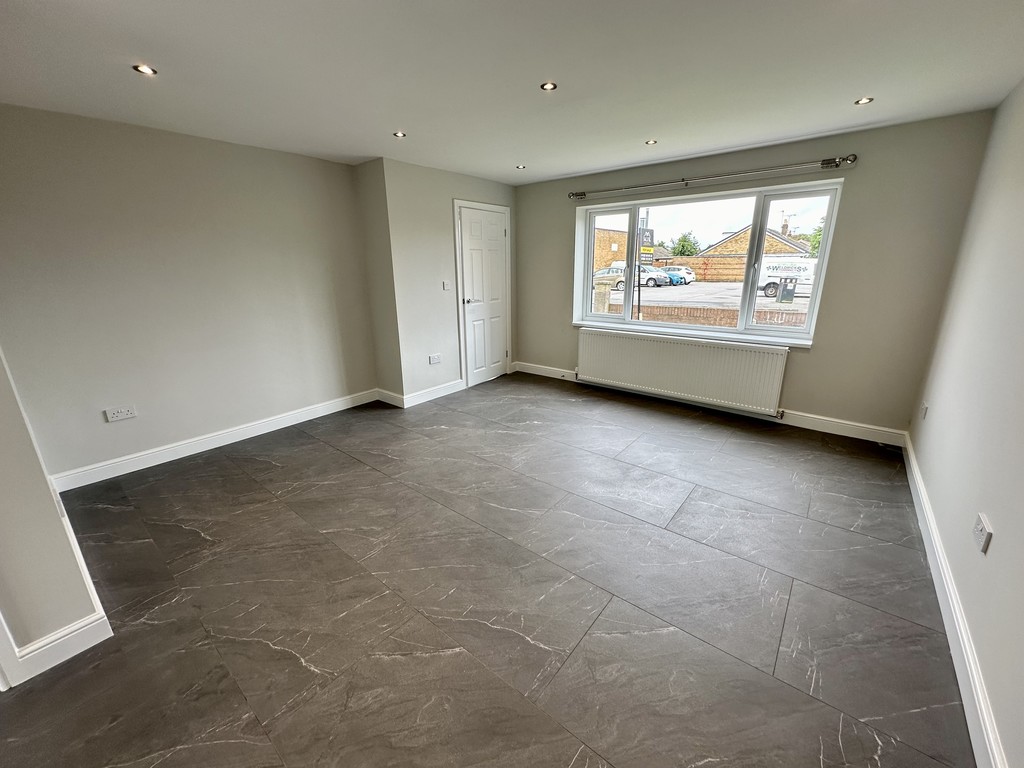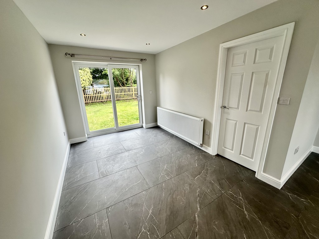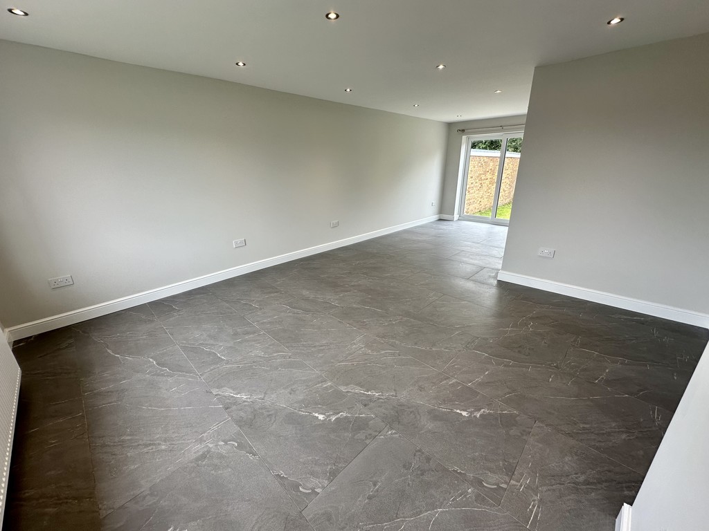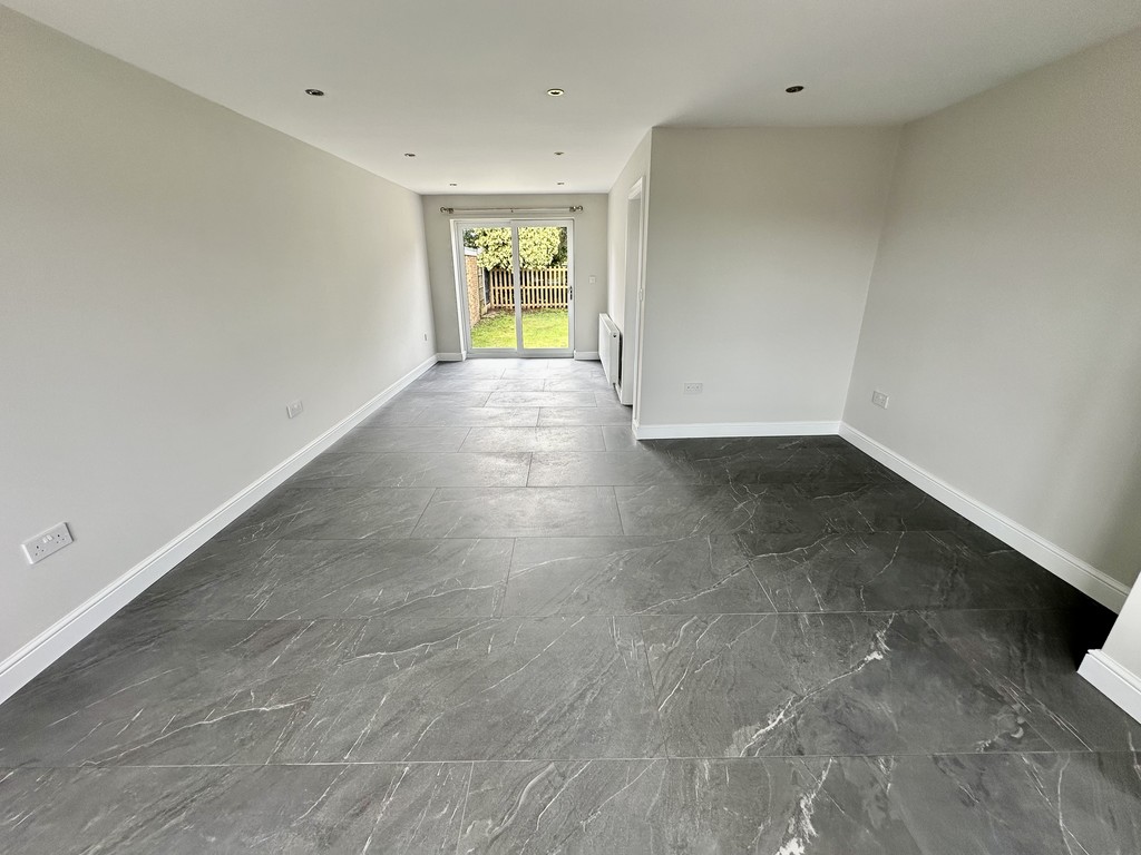LIVING AREA/DINING AREA 14' 2" x 24' 10" (4.34m max & 2.60m min x 7.59m) L-shaped living and dining space that offers a bright entertaining space with rear facing double glazed sliding doors the garden, front facing double glazed window, two radiators, spotlights and tiled flooring throughout.