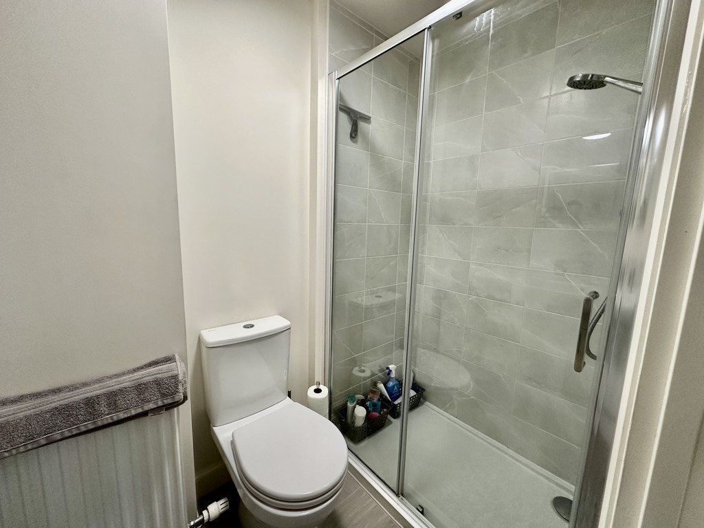 ENSUITE 4' 1" x 7' 10" (1.26m x 2.41m) Immaculately presented shower room comprising of a low flush WC, wash hand basin within a vanity unit, shower cubicle with tiled splash back, radiator and shaving point.