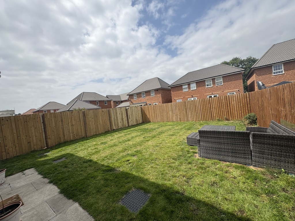 REAR GARDEN Fence enclosed rear garden, mainly laid to lawn with shrub beds, paved patio and another CCTV camera included.