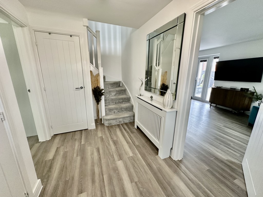 ENTRANCE HALL 5' 10" x 14' 11" (1.80m x 4.55m) The property is accessed via the front facing double glazed frosted door to the entrance hallway, with stairs to the first floor, storage cupboard, further storage cupboard beneath the stairs, radiator, door to the WC and amtico flooring throughout.