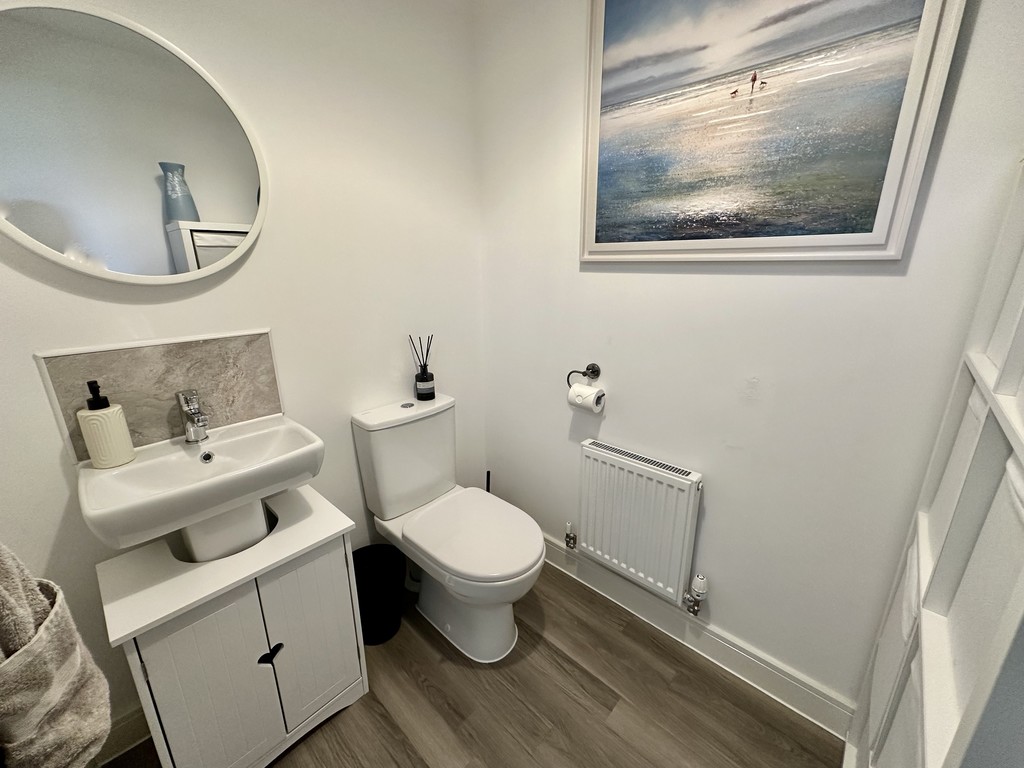 ENSUITE 6' 5" x 4' 7" (1.96m x 1.40m) Immaculate shower room with low flush WC, wash hand basin, shower cubicle, half tiled walls, heated towel radiator, tiled flooring and extractor fan.