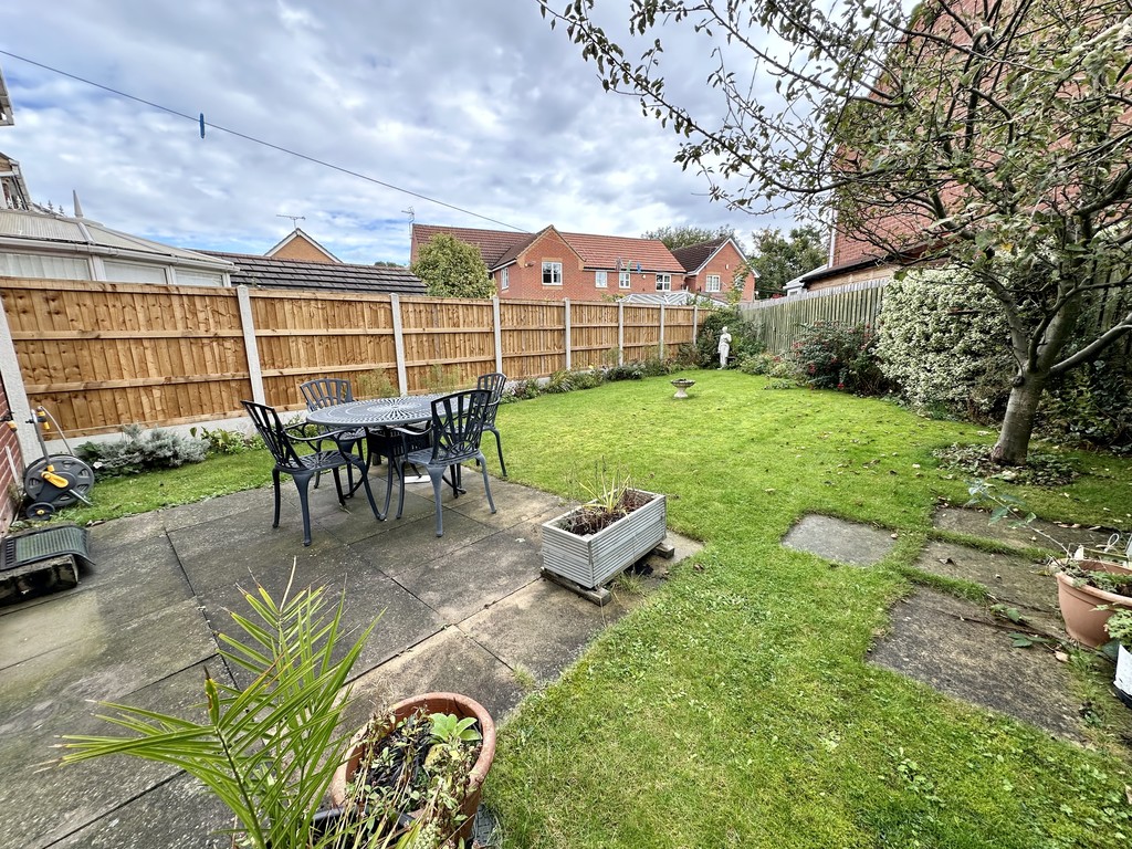 REAR GARDEN V-shaped lawned garden with shrub/flower beds, paved patio and side access path to the front.