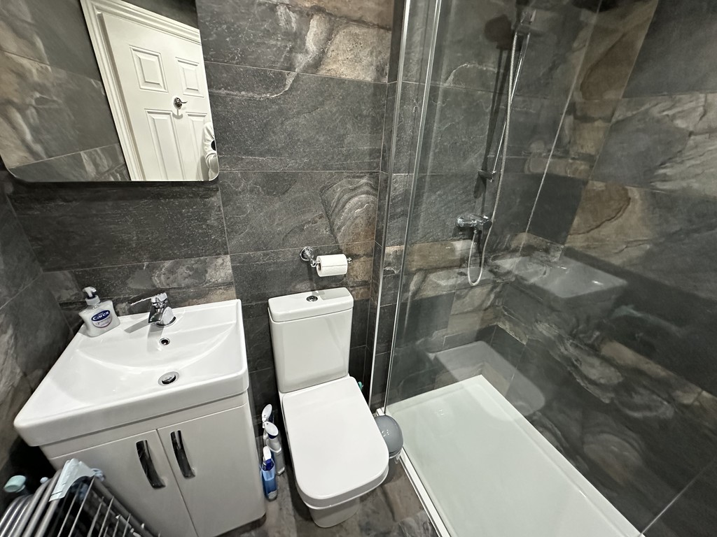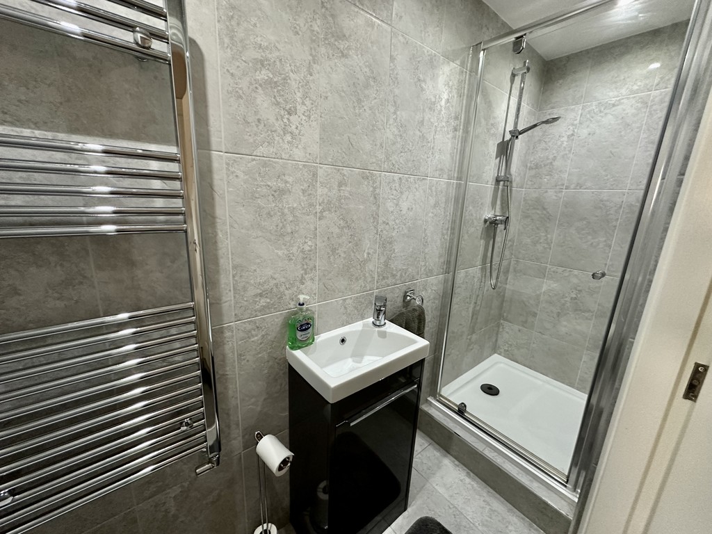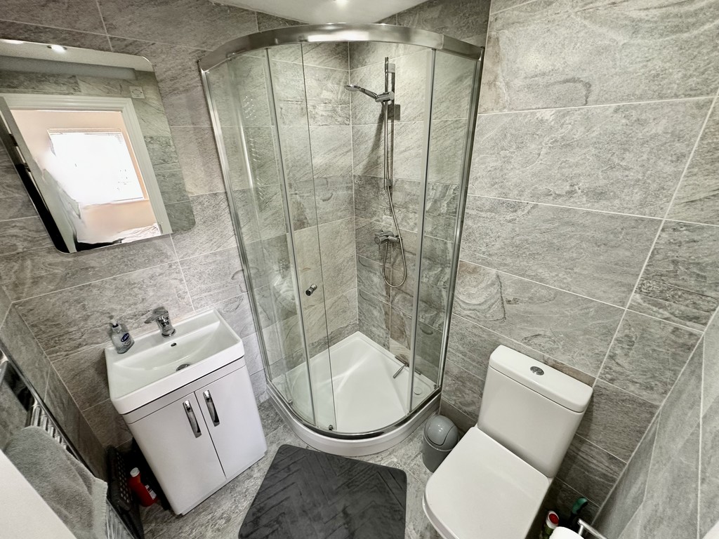 SHOWER ROOM 2' 8" x 9' 2" (0.82m x 2.80m) Lovely shower room comprising of a low flush WC, wash hand basin within a vanity unit, shower cubicle, spotlights, extractor fan, heated towel radiator, tiled flooring and tiled walls.