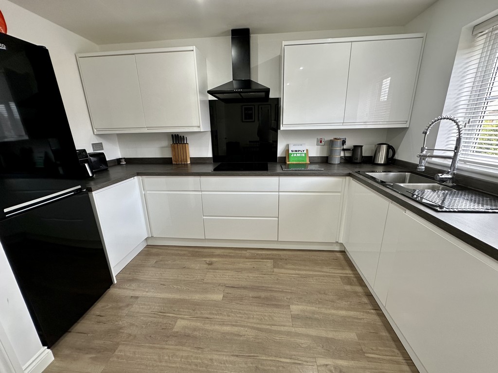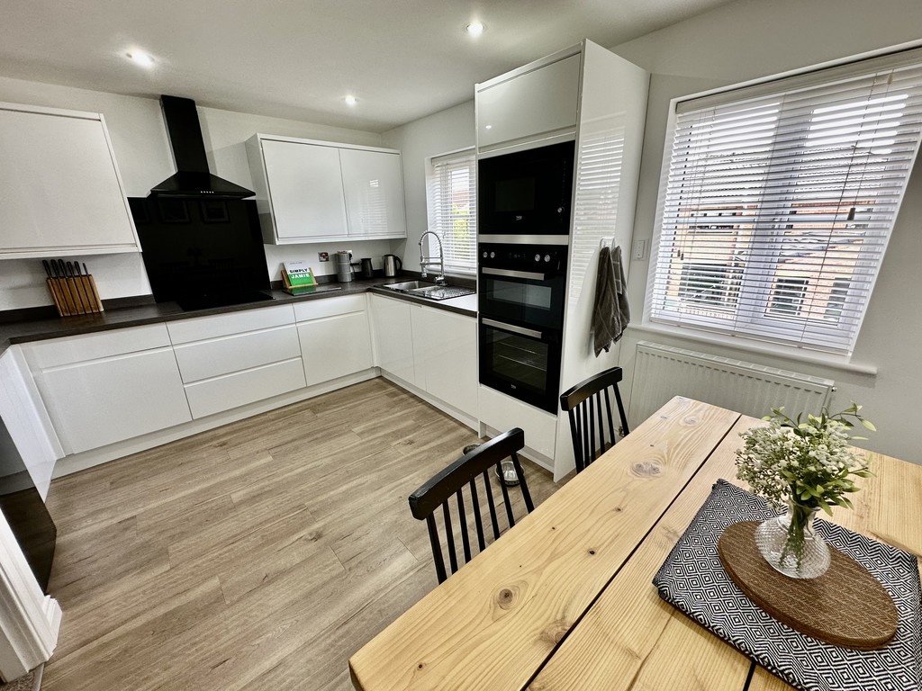 KITCHEN/DINER 14' 7" x 8' 9" (4.46m x 2.67m) L-shaped modern kitchen/diner with fabulous modern kitchen units at both eye and base level, work surfaces incorporating a single and half bowl sink with drainer unit, four ring electric hob with extractor fan above, double electric oven, integrated microwave, integrated dishwasher, space for a fridge/freezer, radiator, two rear facing double glazed windows and spotlights.