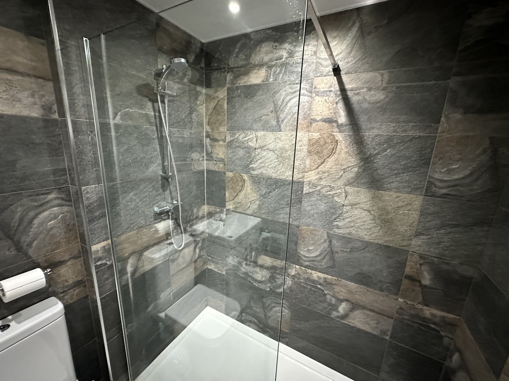 ENSUITE 5' 9" x 6' 5" (1.76m x 1.98m) Lovely shower room comprising of a low flush WC, wash hand basin within a vanity unit, walk in shower with glass divide, tiled walls, tiled flooring, heated towel radiator, spotlights, extractor fan and mirror.