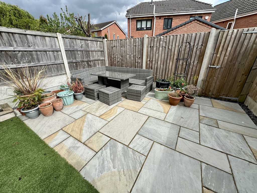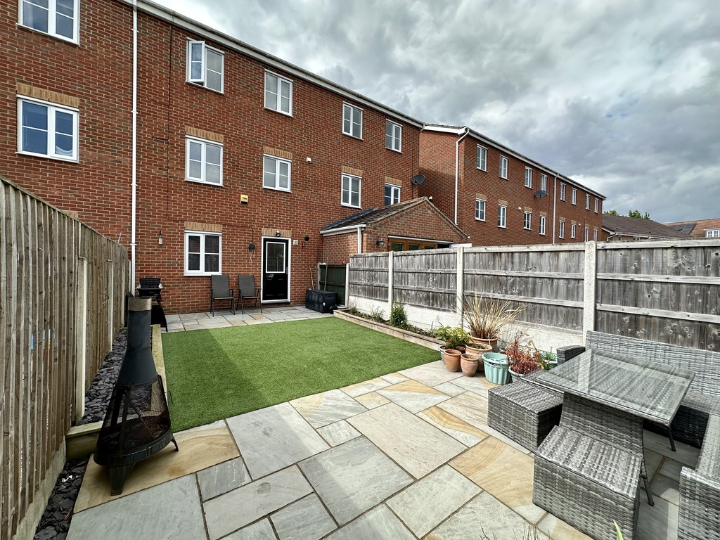 REAR GARDEN Fantastic garden space with paved patio, central astro turf area, raised flower beds, slate beds, rear patio, fence enclosure and rear access gate.
