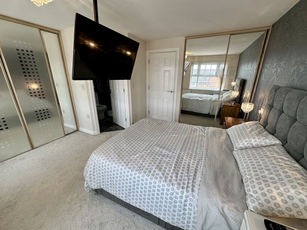 BEDROOM 14' 8" x 12' 1" (4.48m max x 3.69m max) Lovely double bedroom with television ceiling mounted in the centre of the room, two fitted wardrobes, two front facing double glazed windows, radiator and door to the en-suite shower room.
