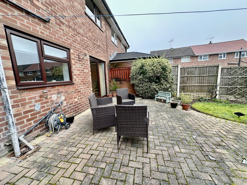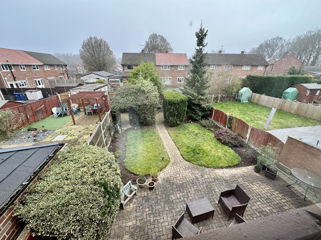 REAR GARDEN With a block paved patio, fence/wall enclosure, central lawn with paved path, further paved patio to the rear, mature trees/bushes and two sheds included.