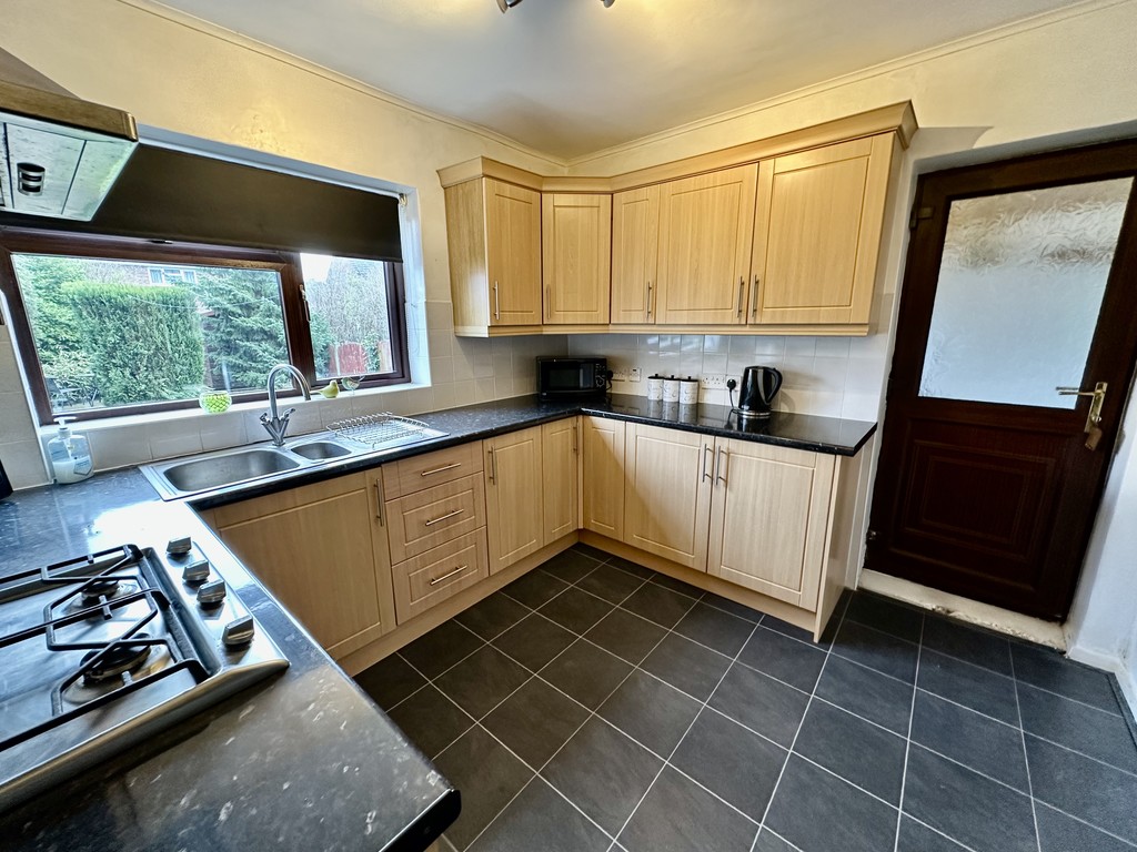 KITCHEN 9' 8" x 9' 6" (2.96m x 2.90m) Nicely presented kitchen with a range of fitted cabinetry at both eye and base level, work surfaces incorporating a single and half bowl sink with drainer unit, four ring gas hob with extractor hood above, single electric oven, partially tiled splash backs, space for a fridge/freezer, rear facing double glazed window, side facing double glazed frosted door to the side entrance hallway and open access to the dining room.
