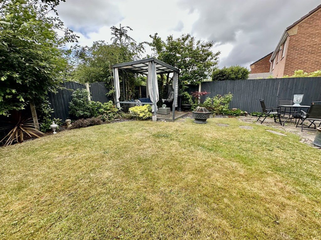 REAR GARDEN Fence enclosed rear garden with paved patio, central lawn, surrounding, shrubs/bushes/trees, raised decking with pergola and decorative slate beds.