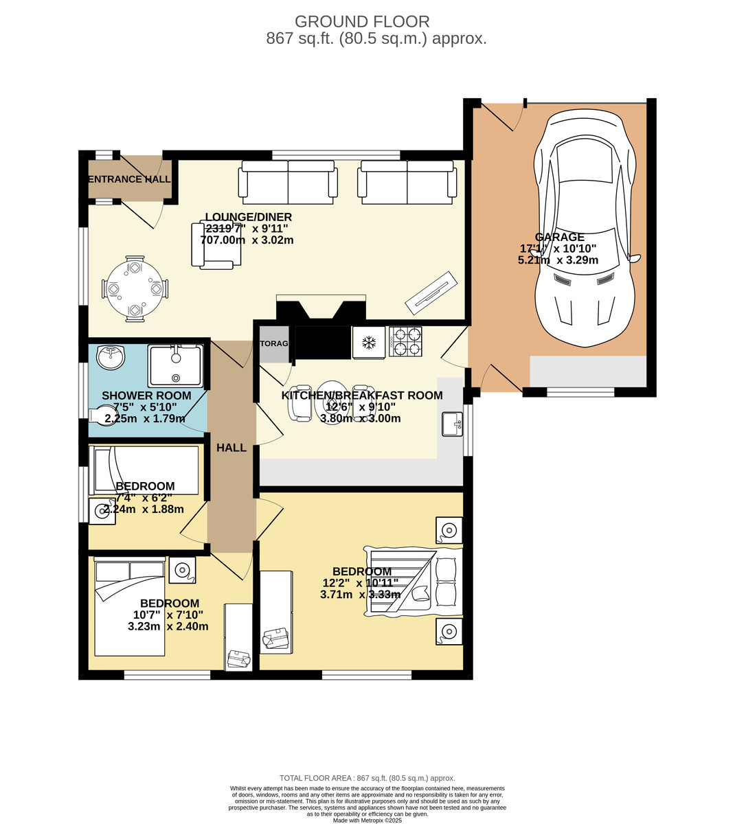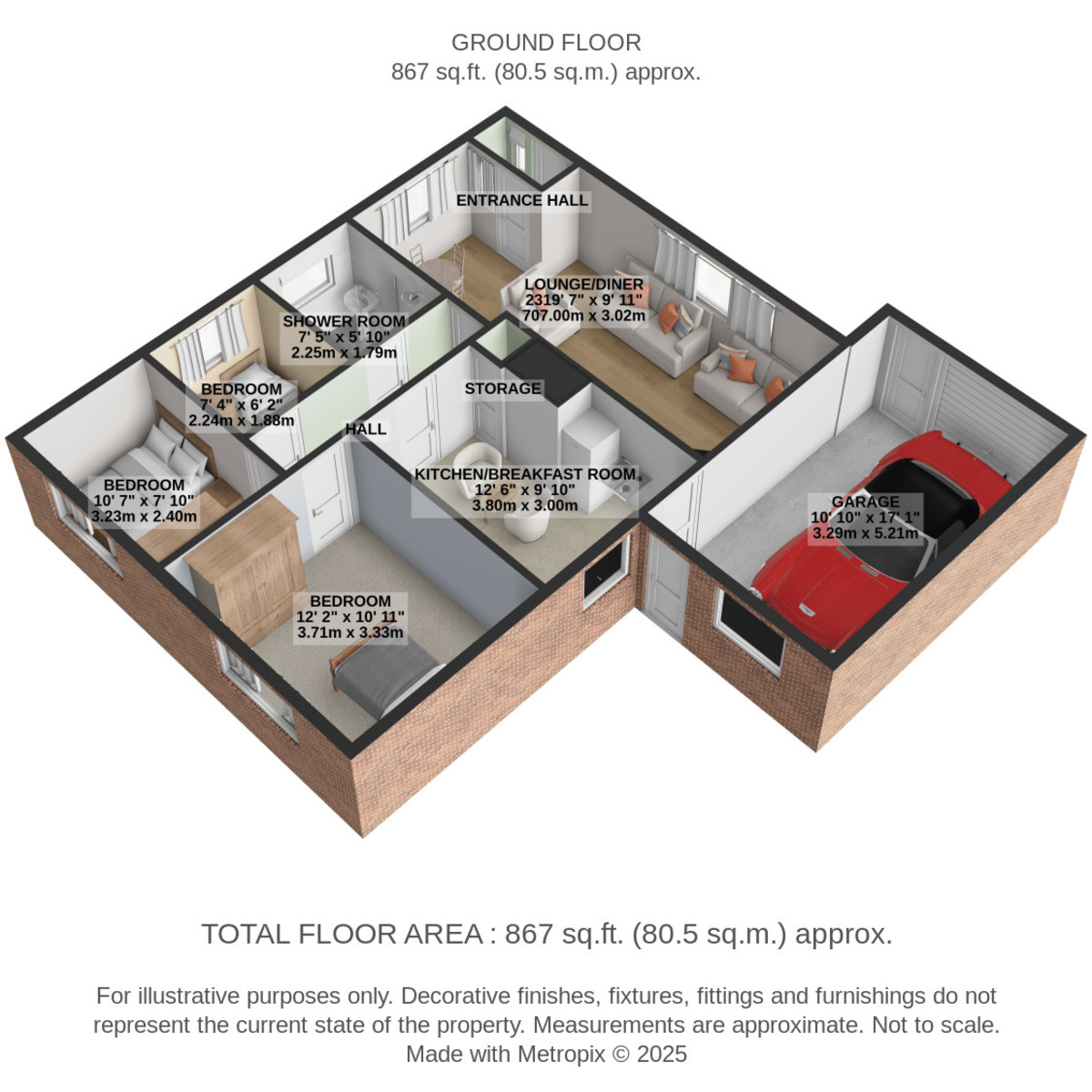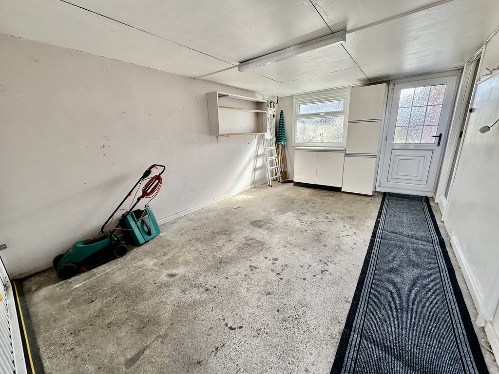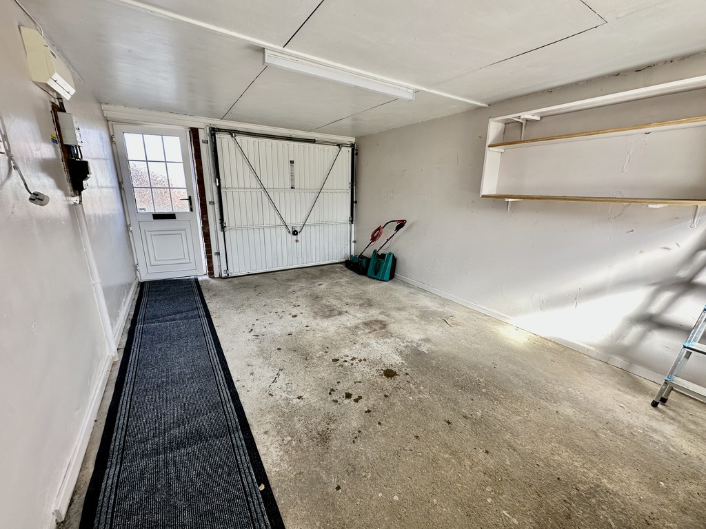 ATTACHED GARAGE 10' 9" x 17' 1" (3.29m x 5.21m) Slightly oversize garage with up and over front door, further front/rear facing double glazed doors to the garden/driveway, rear facing double glazed window, door to the kitchen, fitted base level storage units, power points and lighting.