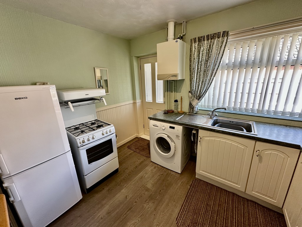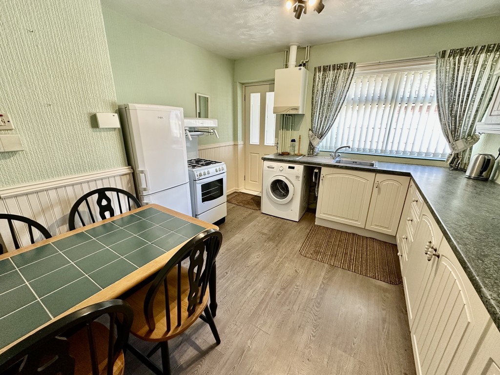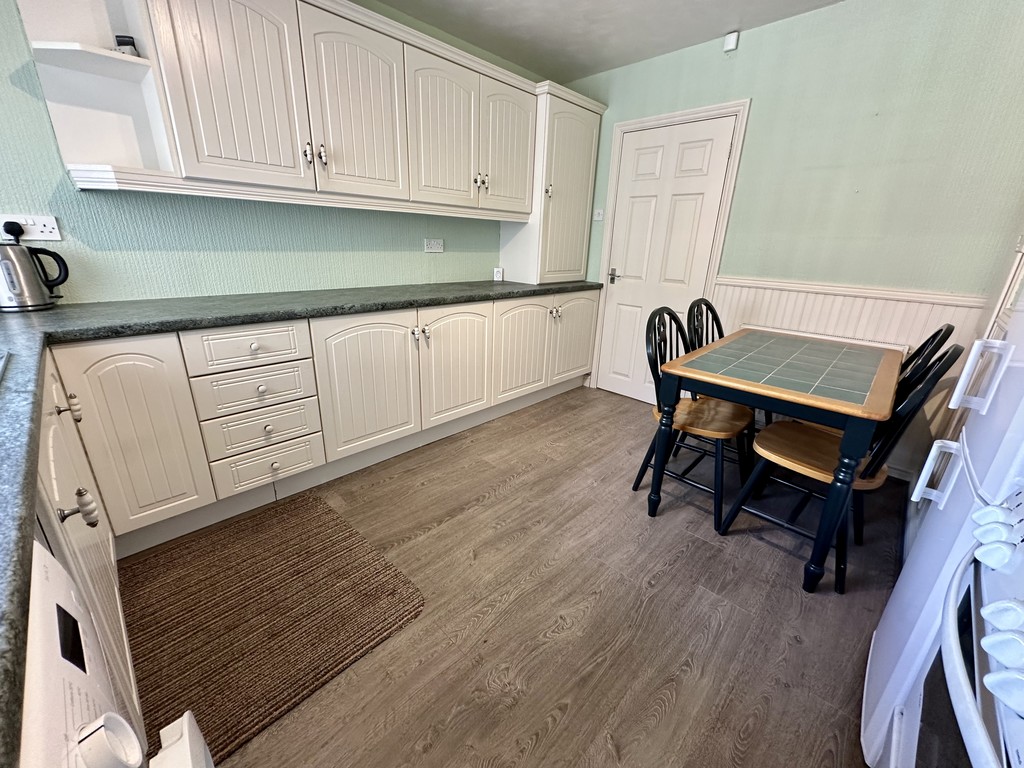 KITCHEN/DINER 12' 5" x 9' 10" (3.80m x 3.00m) Nicely presented kitchen with space for dining, fitted kitchen cabinetry at both eye and base level, work surfaces incorporating a single bowl sink with drainer unit, space for a fridge/freezer, space for a cooker with gas hob, plumbing for a washing machine, wall mounted boiler unit, dado rail, door to the garage, side facing double glazed window, radiator and storage cupboard.