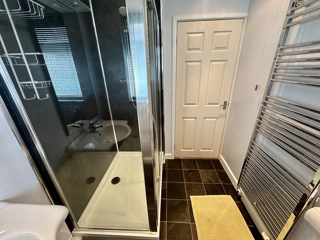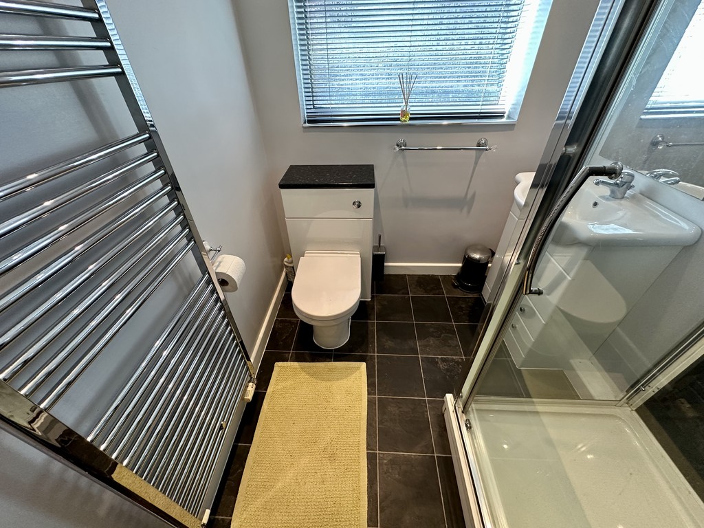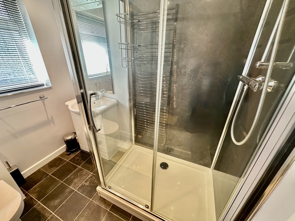 SHOWER ROOM 7' 4" x 5' 10" (2.25m x 1.79m) Beautiful modern shower room comprising of a low flush WC, wash hand basin within a vanity unit, shower cubicle, shower above, heated towel radiator, spotlights, side facing double glazed frosted window, wall mounted mirror unit and incorporated lighting.
