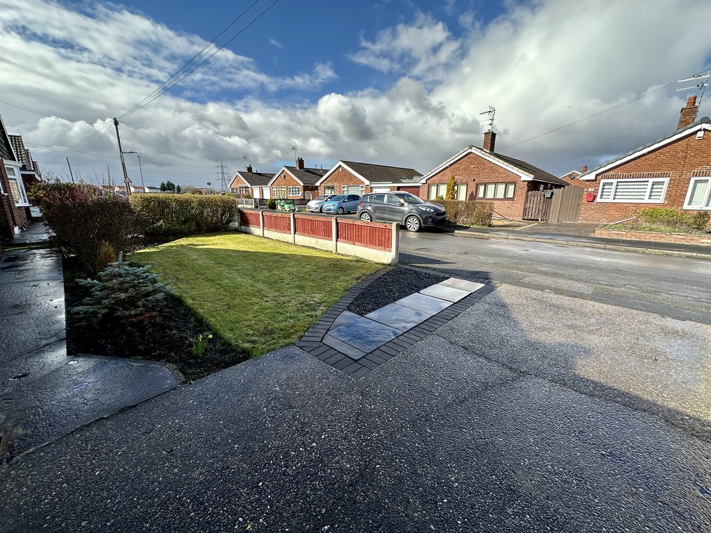FRONT GARDEN & DRIVEWAY Small lawned area, mature bushes/shrubs, partially fence enclosed, paved/slate area and off street parking is available on the driveway.
