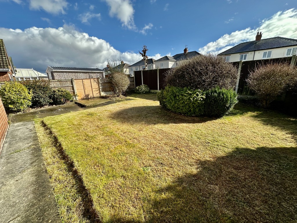 REAR GARDEN Fence enclosed rear garden with central lawn, side patio and mature bushes/shrubs.