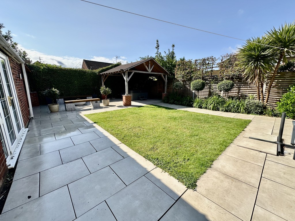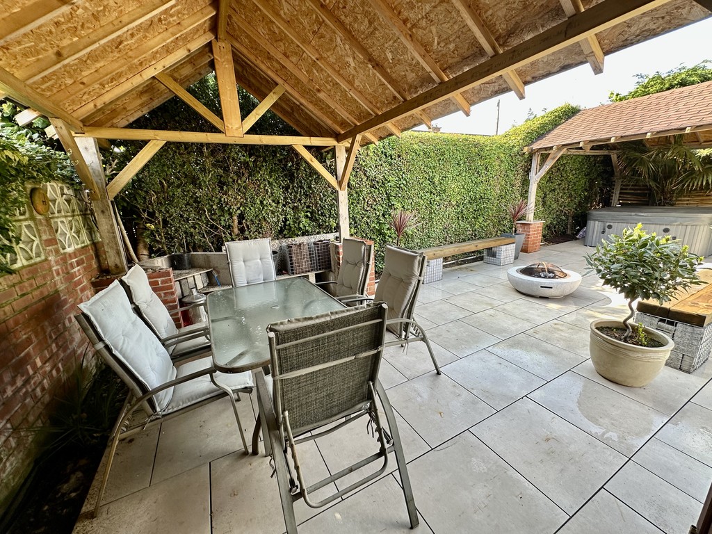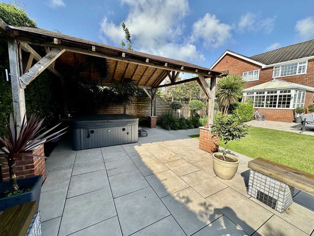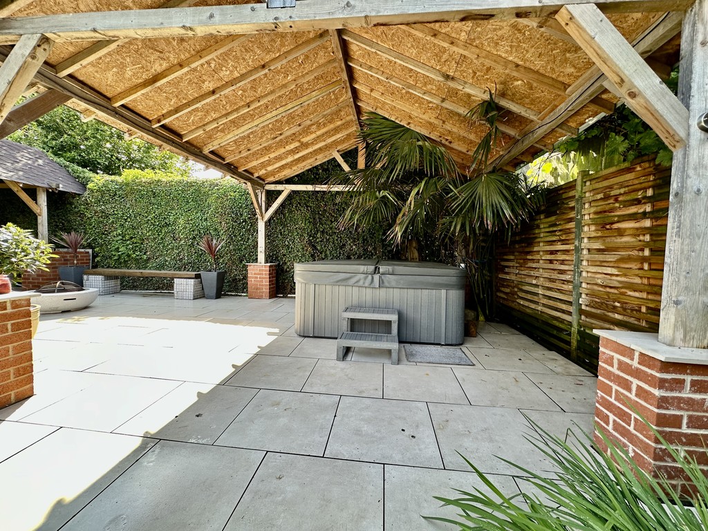 REAR GARDEN Stunning garden with central lawn and great paved patio area surrounding the lawn, lower pergola areas above the hot tub and private garden seating area, raised planting areas with mature mixed bushes/trees, shed included and hot tub is negotiable.