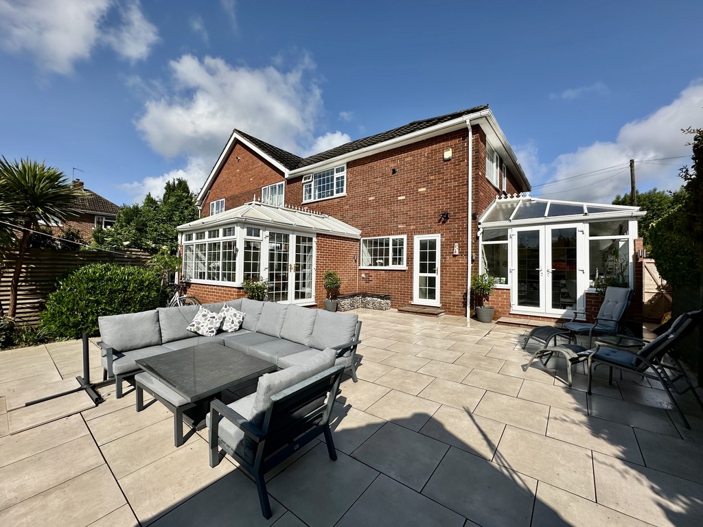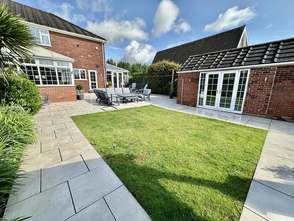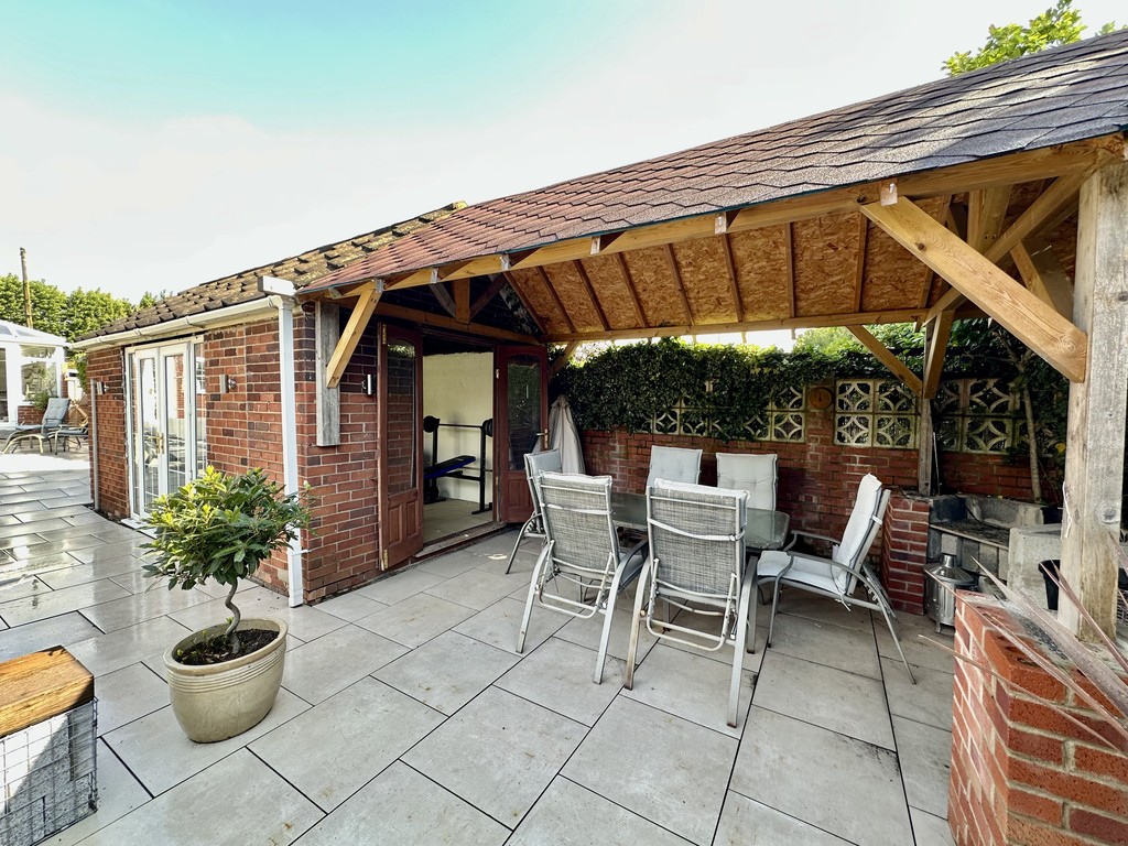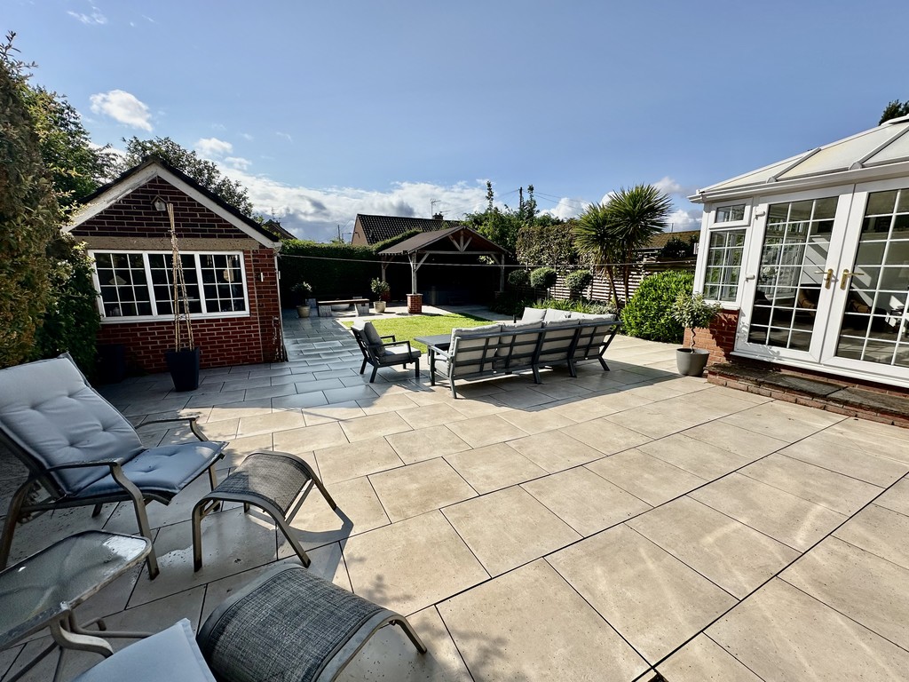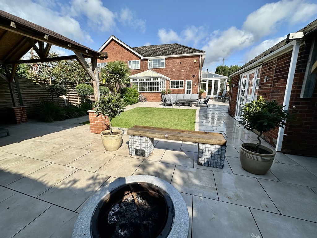 REAR GARDEN Stunning garden with central lawn and great paved patio area surrounding the lawn, lower pergola areas above the hot tub and private garden seating area, raised planting areas with mature mixed bushes/trees, shed included and hot tub is negotiable.