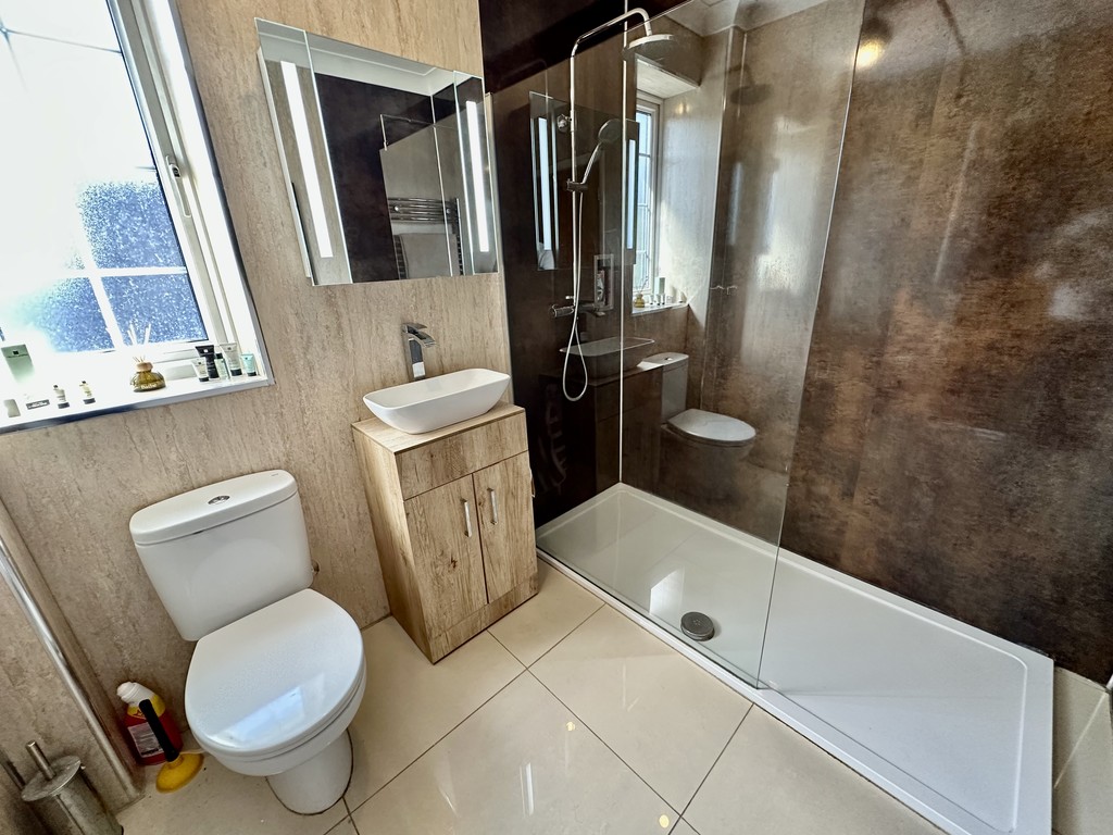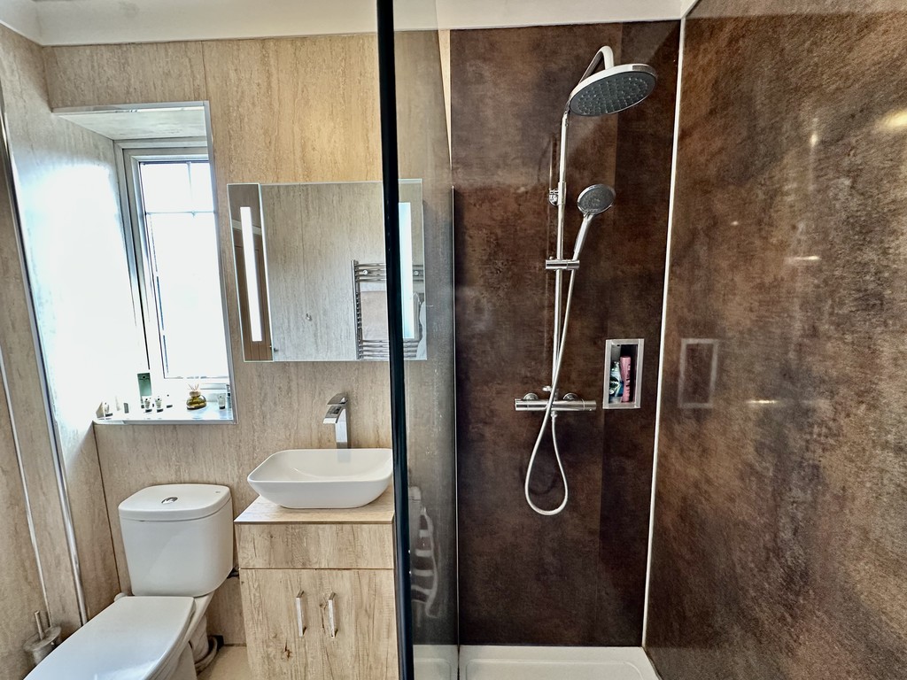 SHOWER ROOM 6' 3" x 7' 10" (1.93m x 2.39m) Immaculately presented modern shower room with walk in shower area with dual shower head, glass divide, low flush WC, feature wash hand basin within a vanity unit, heated towel radiator, LED mirror, coving and side facing double glazed frosted window.