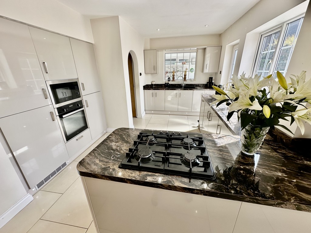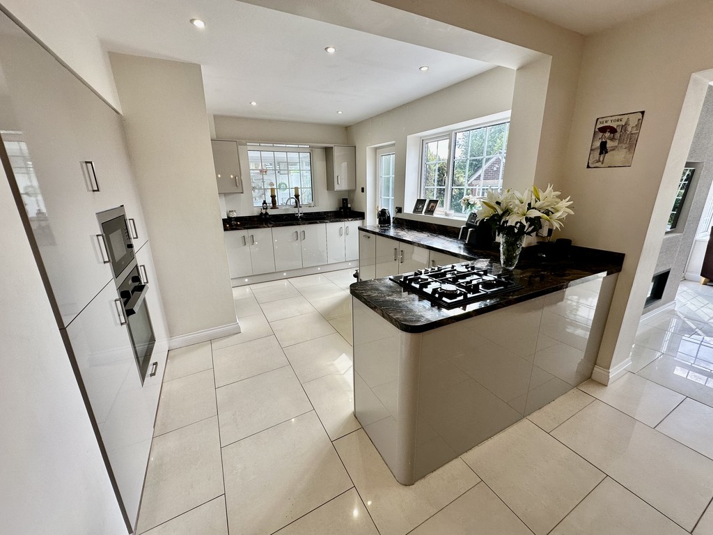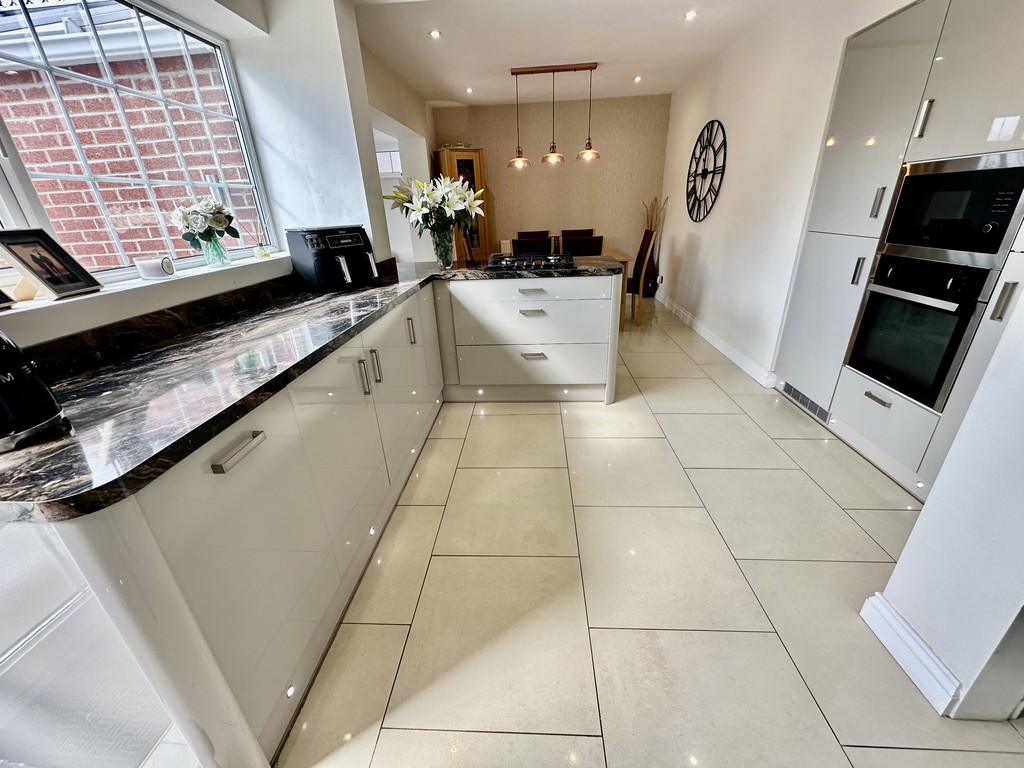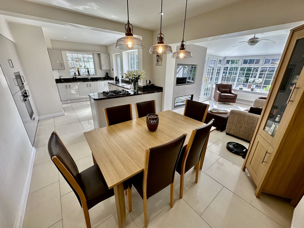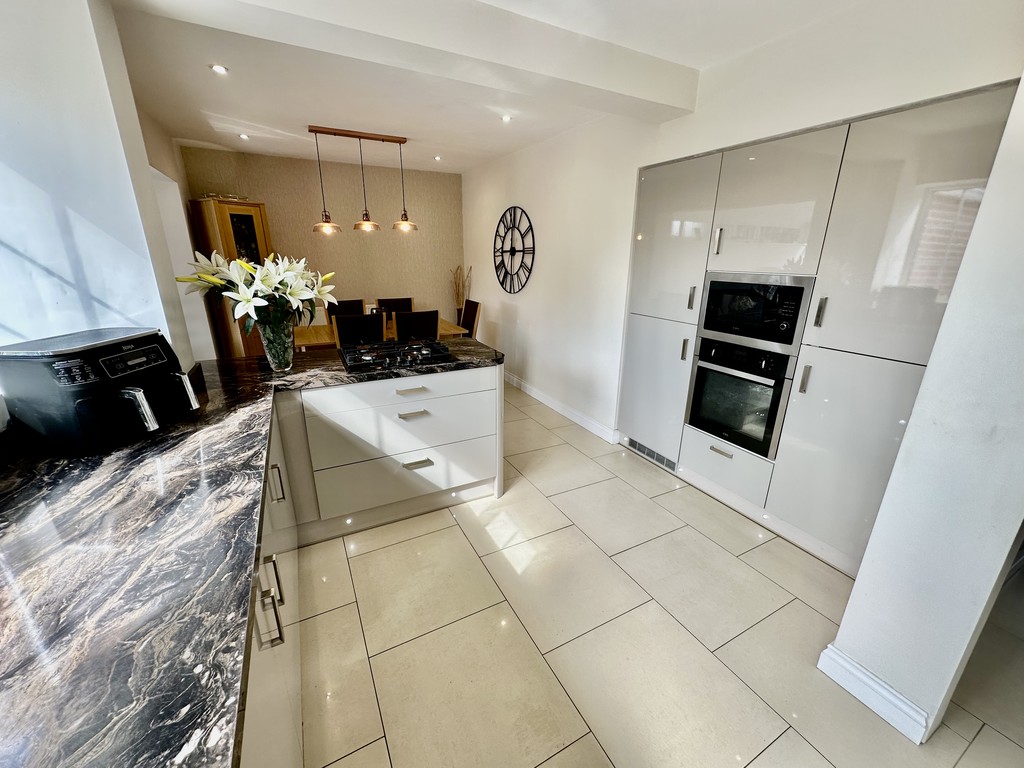 KITCHEN/DINER 23' 9" x 9' 9" (7.24m x 2.98m) Amazing kitchen/dining space and perfect for entertaining with a range of modern fitted cabinetry at both eye and base level, beautiful work surfaces with matching splash backs, incorporating a single bowl sink with drainer unit, four ring gas hob, single electric oven, integrated microwave, integrated slimline dishwasher, integrated fridge/freezer, built in washing machine, built in tumble dryer, tiled flooring, spotlights, open access to the conservatory extension, open access to the hallway, side facing double glazed window, rear facing double glazed window and rear facing double glazed frosted door to the garden.