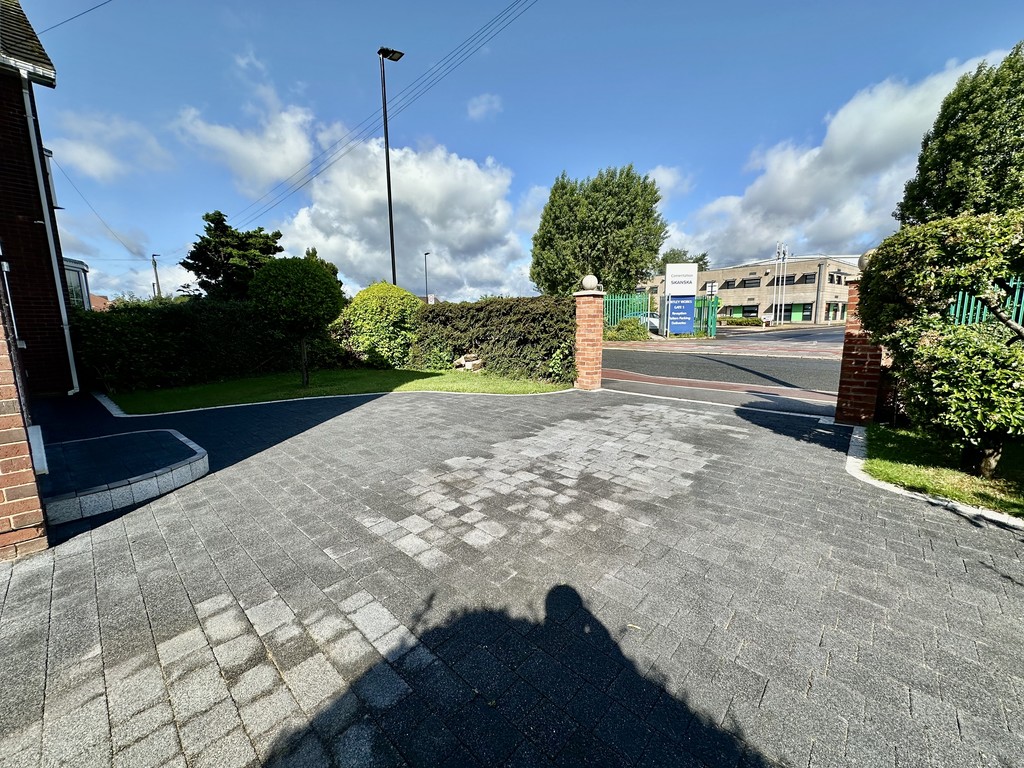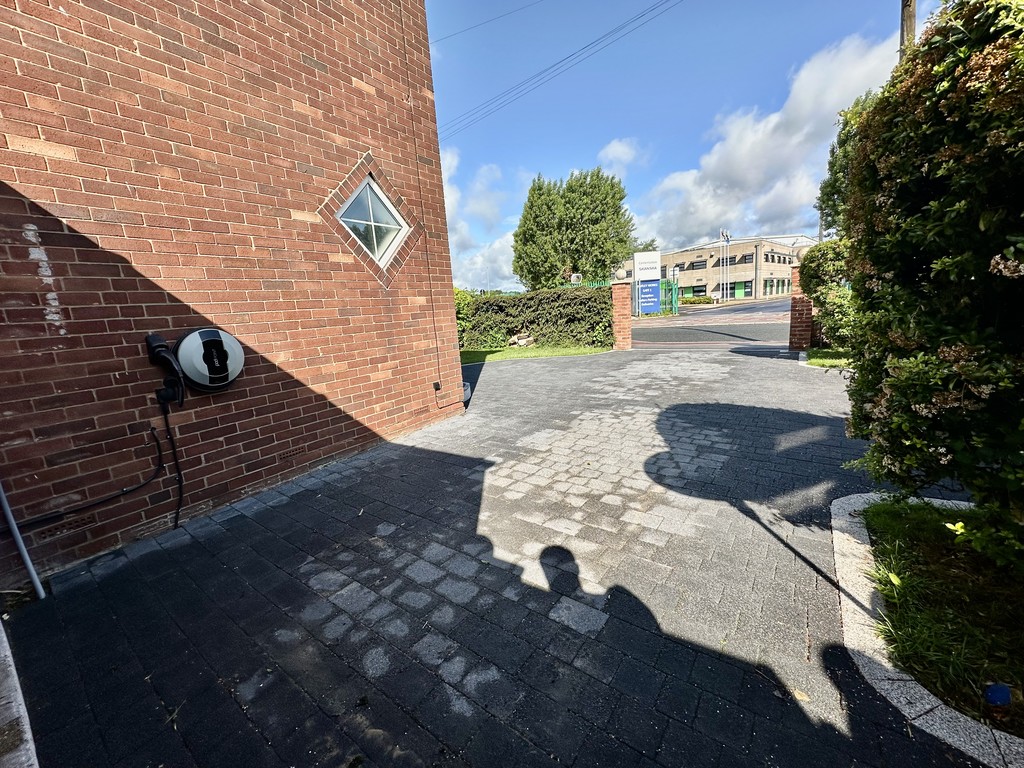 FRONT GARDEN/DRIVEWAY Open access to the paved driveway in two tone grey providing off street parking for cars, electric car charging point, wall enclosure with decorative gate posts, side access via a gate, plus a small lawned area with mature bushes/shrubs.