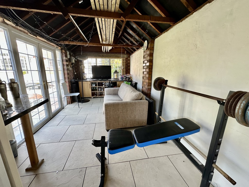 GYM/BAR AREA 8' 11" x 16' 11" (2.74m x 5.17m) External building used for gym purposes and a bar area with rear facing double glazed French doors, side facing double glazed French doors, front/side facing double glazed windows, tiled flooring and power points.