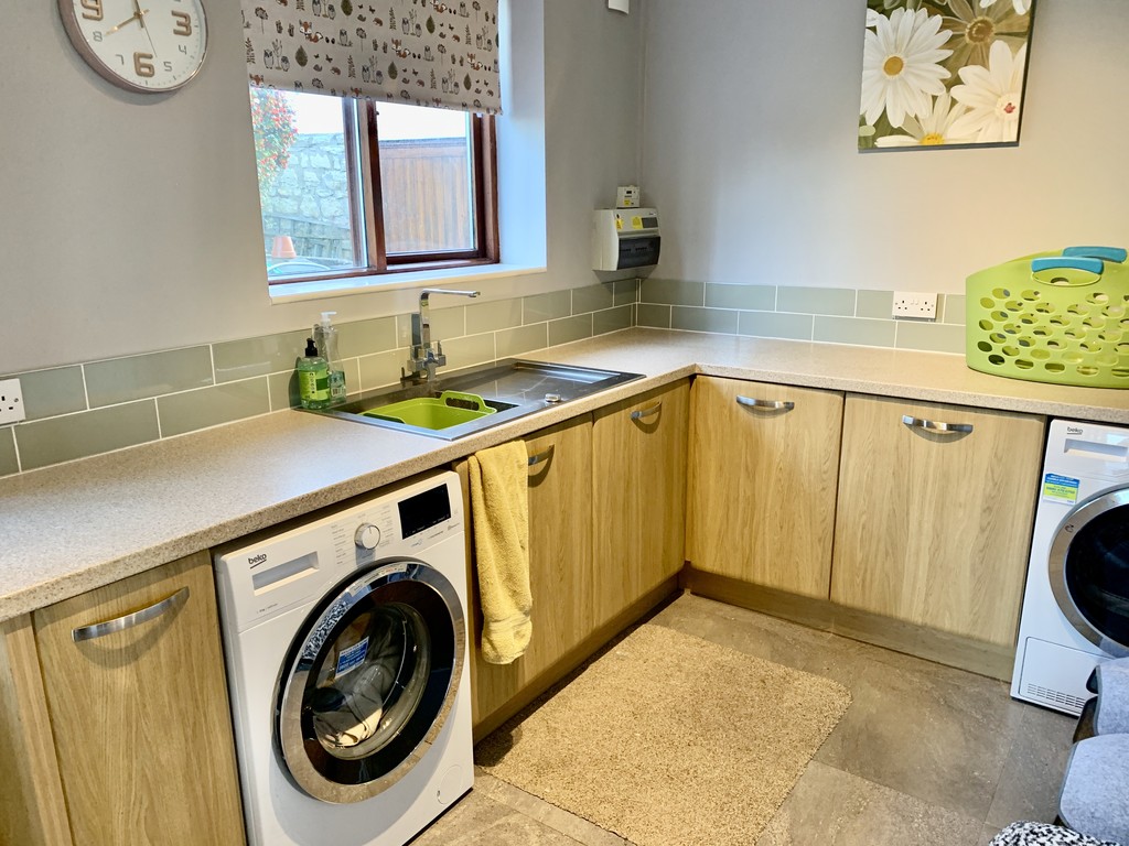 11' 10" x 7' 6" (3.62m x 2.31m) Useful utility space with further fitted units, roll top work surfaces incorporating a single bowl sink with drainer, plumbing for washing machine, space for a tumble dryer, partially tiled walls, electric wall mounted heater, side facing double glazed window and side facing double glazed door.