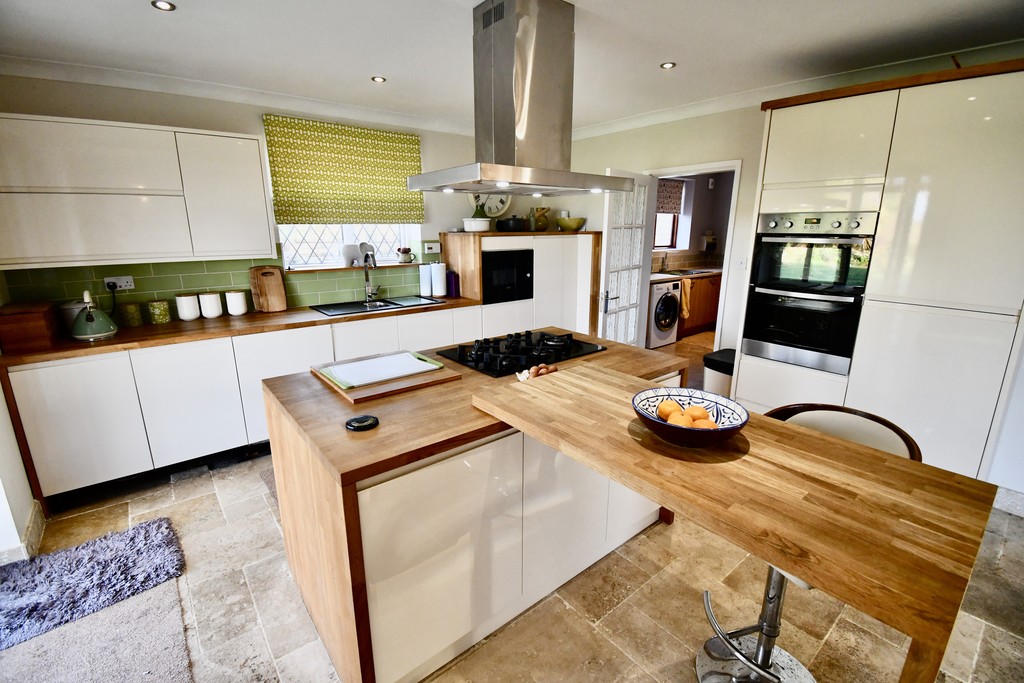 13' 9" x 24' 8" (4.20m x 7.53m) Superb open plan living kitchen/dining room with modern fitted kitchen units at both eye and base level, work surfaces incorporating a single and half bowl sink with drainer, five ring gas hob with extractor hood above, double electric oven, integrated fridge/freezer, integrated dishwasher, integrated microwave, partially tiled splash backs, tiled flooring, matching breakfast bar, spotlights, vertical radiator, two rear facing double glazed sliding doors to the garden, door to the utility room and open access to the hallway.