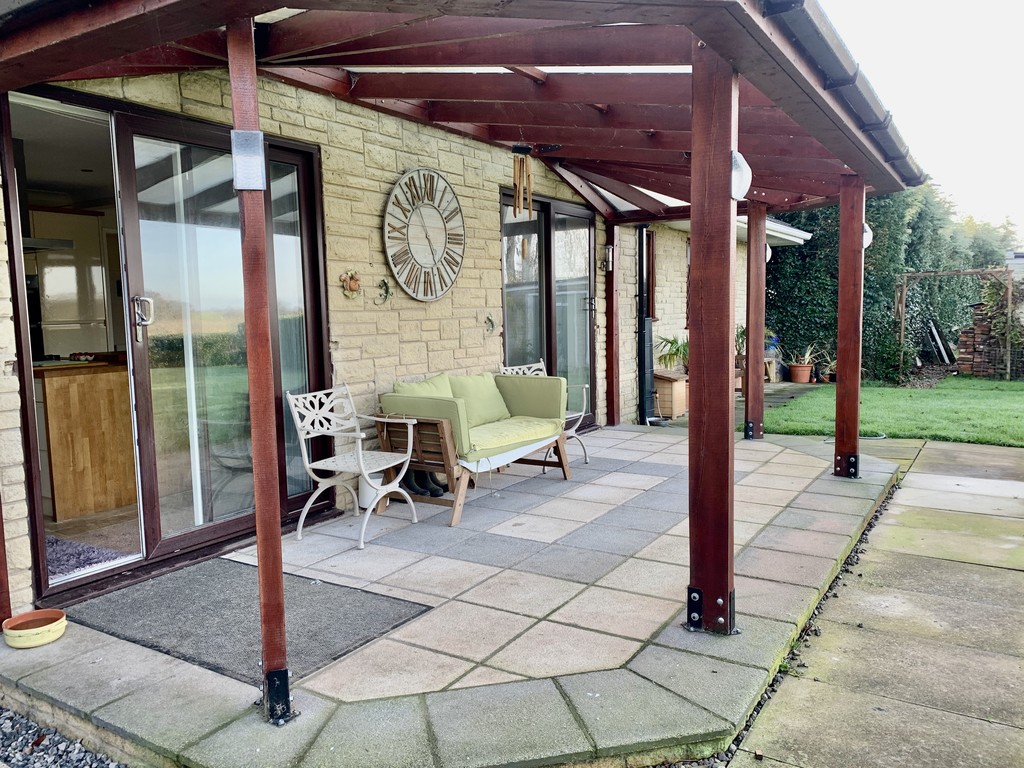 Large lawned garden with under cover small patio area, storage outbuilding, shrub beds and open field views to the rear.