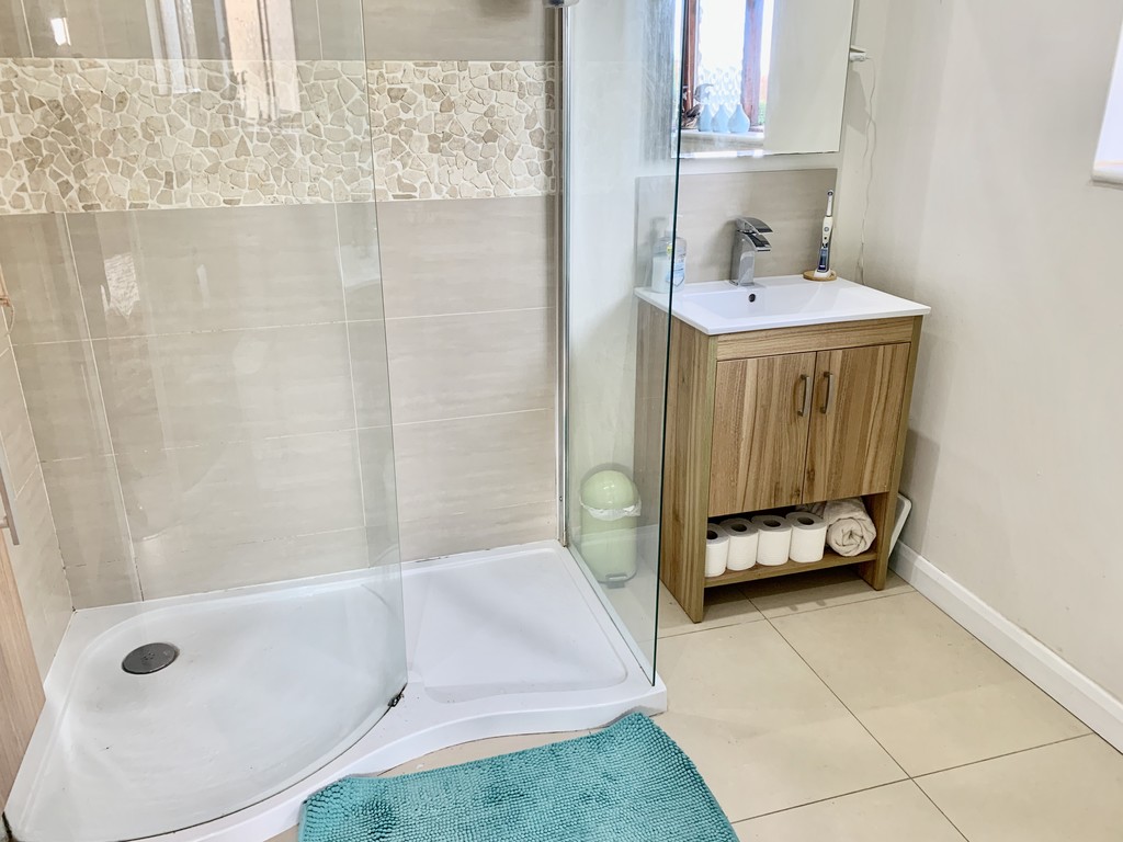 7' 1" x 7' 6" (2.18m x 2.30m) Nicely presented shower room with walk in shower, wash hand basin within a vanity unit, low flush WC, partially tiled walls, spotlights to the ceiling, extractor fan, tiled flooring, heated towel radiator and a side facing double glazed frosted window.