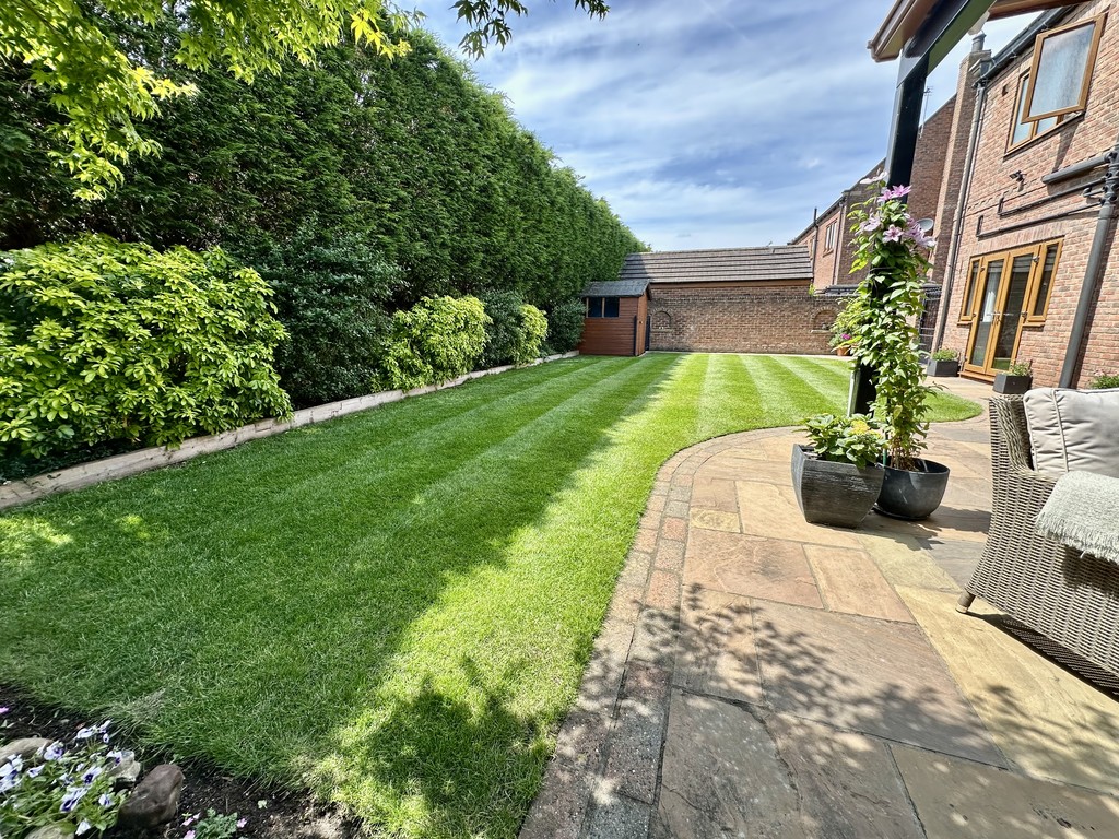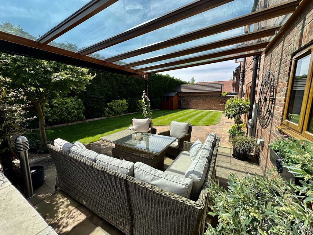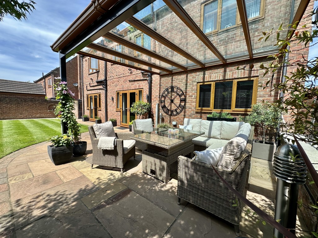 REAR GARDEN The rear garden is an amazing outdoor entertaining space with glass pergola above the patio, central lawn with further raised patio area, hedge/bushes to the rear, two sheds for storage, mature tree with flower bed and side access via a gate.