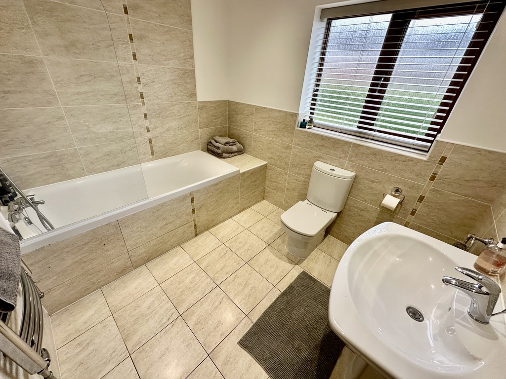 WC 7' 1" x 6' 9" (2.16m x 2.06m) Benefitting from a low flush WC, wash hand basin, tiled splash back, tiled flooring, coving, under floor heating and side facing double glazed frosted window.