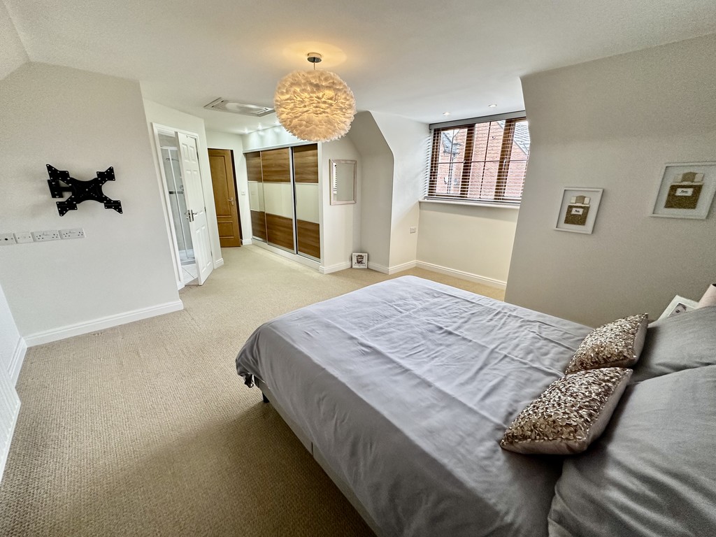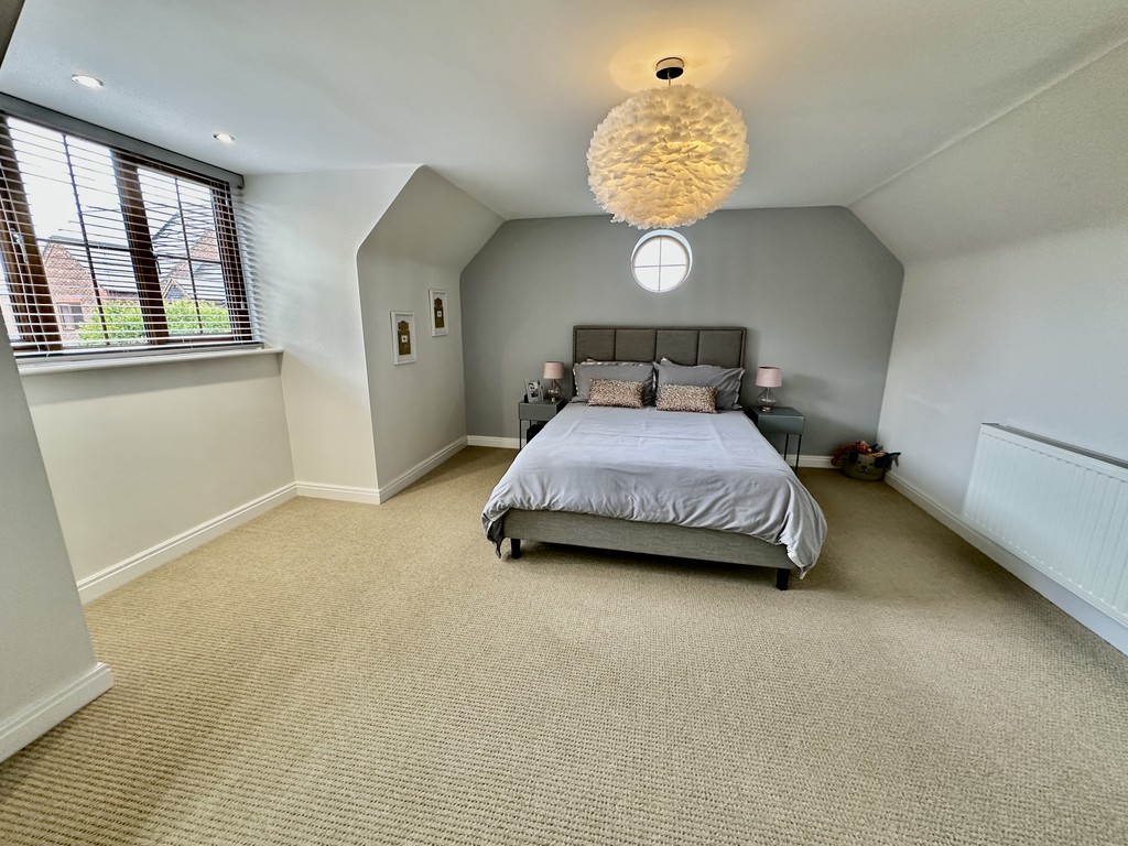 BEDROOM 13' 1" x 22' 6" (4.00m x 6.88m max) Superb second master large bedroom above the double garage with fitted sliding wardrobes, side facing double glazed window, feature front facing double glazed window, radiator, spotlights, loft access point and door to the en-suite shower room.