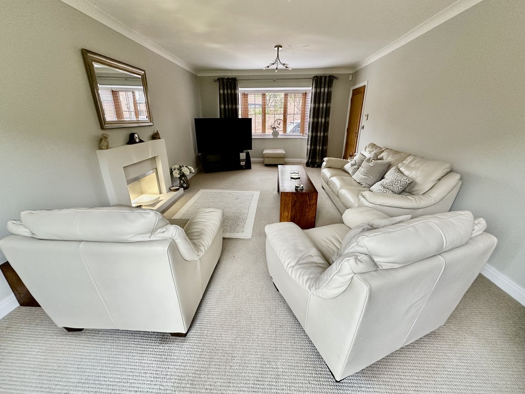 BATHROOM 8' 8" x 7' 4" (2.66m x 2.25m) Immaculately presented bathroom with low flush WC, wash hand basin, heated towel radiator, bath, tiled flooring, half tiled walls, spotlights, coving to the ceiling and rear facing double glazed frosted window.