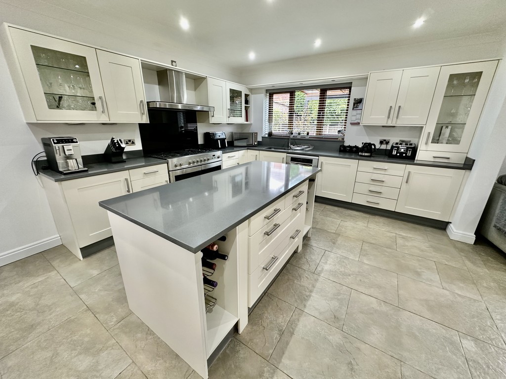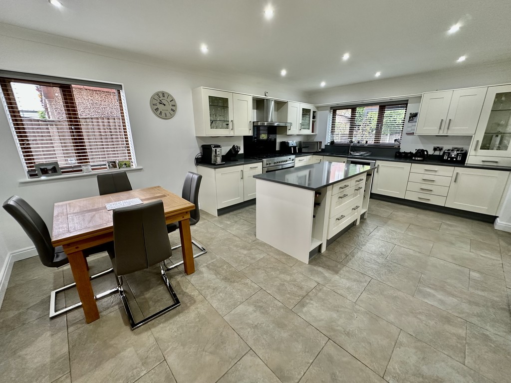 KITCHEN/DINER 12' 11" x 19' 10" (3.94m x 6.05m) Stunning open plan L-shaped living kitchen/diner with open access to the reception/sitting area, modern beautiful kitchen space with a range of fitted cabinetry at both eye and base level, matching central storage island, work surfaces incorporating a single and half bowl sink with drainer, glass fronted cabinets, feature under lighters, spotlights, integrated fridge, dishwasher, freestanding range style cooker with six ring gas hob, tiled flooring, under floor heating, rear facing double glazed window, side facing double glazed window and door to the utility room.