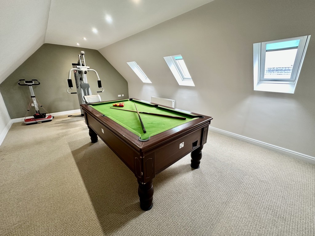 BEDROOM/GAMES ROOM 19' 10" x 12' 11" (6.05m x 3.95m) Utilised as a games room with pool table once again this bedroom has versatile use to suit all families, with three rear facing double glazed velux style windows, storage cupboard, spotlights, loft access point and radiator.